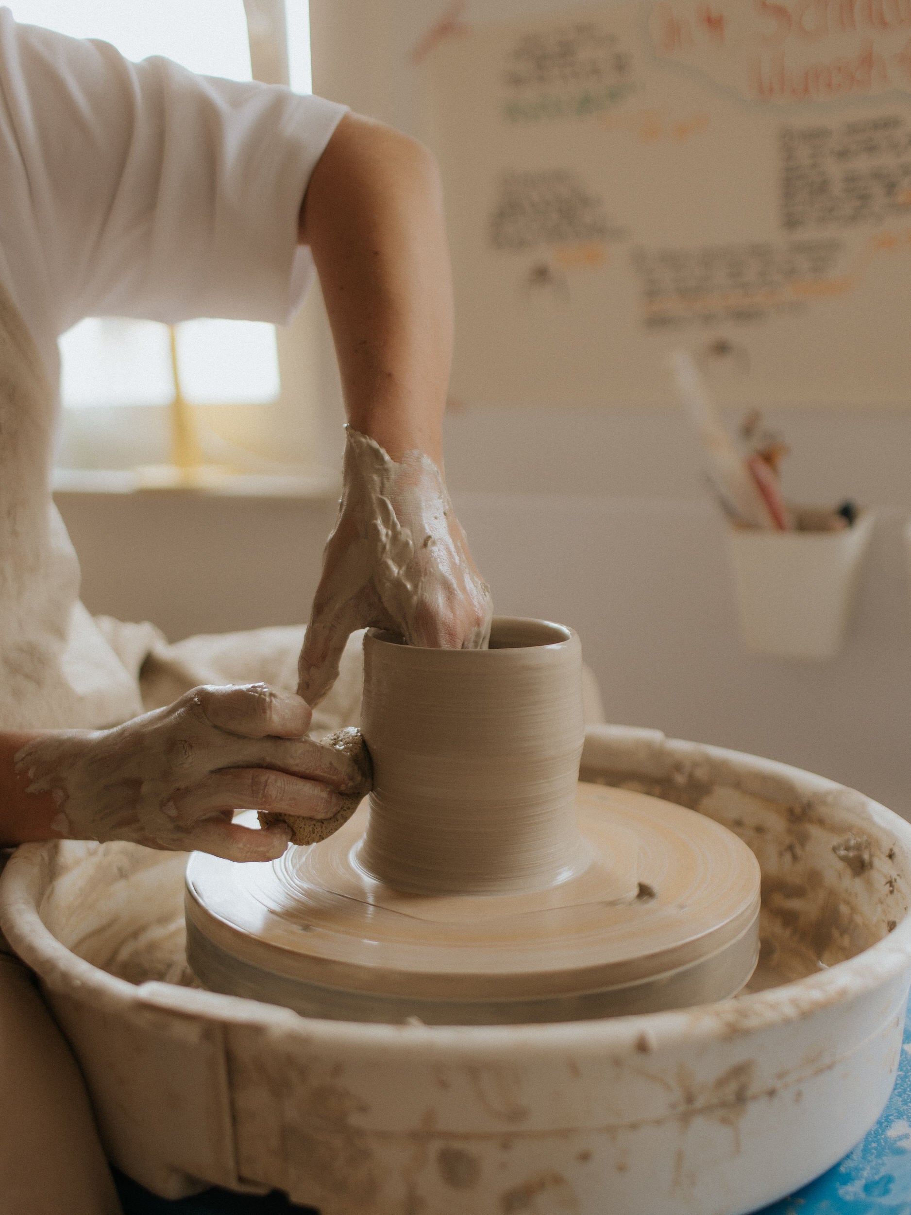 In diesem Kurs bekommst du eine entspannte Einführung in die Welt des Töpferns – ganz ohne Vorkenntnisse. Gemeinsam entdecken wir die Grundlagen an der Drehscheibe: Ton kneten, zentrieren und das Drehen kleiner Objekte. Dabei darfst du deiner Kreativität freien Lauf lassen und eigene Stücke gestalten.